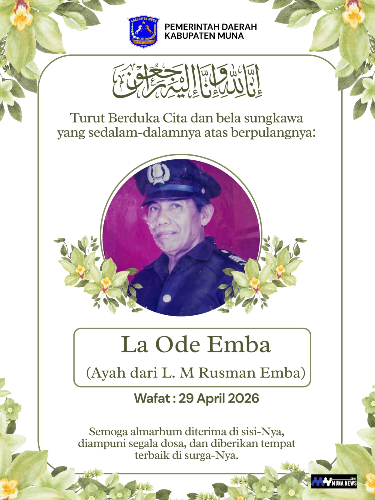 Raha-munanews.com. Pemerintah Daerah Kabupaten Muna menyampaikan ucapan belasungkawa atas meninggalnya Bapak H. La Ode Emba, yang merupakan Orang Tua dari Mantan Bupati Muna LM Rusman Emba, Semoga Almahurm diterima disisi Allah SWT, dan keluarga yang ditinggalkan diberikan Ketabahan, Aamiin 🤲